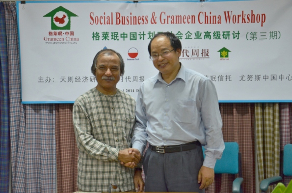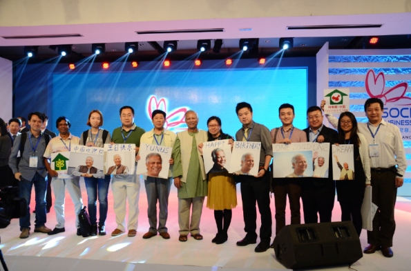 为了推广格莱珉模式和社会企业,尤努斯博士于2010年开始在达卡举行“全球社会企业日”(Global Social Business Day)。历年的全球社会企业日都吸引了来自全世界各地的政界、商界、学界知名人士出席,到会人数均在千人以上。各界人士齐聚一堂,共同探讨如何运用格莱珉微型金融模式和社会企业来消除贫苦及解决社会问题之道。2014年6月28日,天则经济研究所中国企业家研究中心与尤努斯中国中心协力并共同组织了中国企业家代表团亮相本届大会。会上,大家深切的感受了社会企业透过商业手法运作,赚取利润用以贡献社会的模式。由于社会企业日当天也是格莱珉银行及社会企业创办人尤努斯博士的生日,中国代表团成员在会议间隙还集体上台为他祝贺生日并合影留念。此外,出席本次会议的还有众多社会名流,如美国前总统肯尼迪外甥女玛丽娅、达能CEO范易谋(Emmanuel Faber)、尼泊尔首富宾诺德•召德里(Binod Chaudhary)、美国驻孟加拉国大使丹•莫泽那(W. Dan Mozena)、孟加拉威利雅水务veolia water高管等。