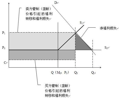 图中深灰色部分是行政性垄断带来的社会福利净损失,我们称之为“社会福利损失一”;图中浅灰色部分是由垄断(管制)价格带来的分配扭曲部分,我们称之为行政性垄断的“社会福利损失二”;图中中灰色部分是买方的垄断(管制)价格(即较低或零的资源价格)带来的分配扭曲,我们称之为行政性垄断的“社会福利损失三”。