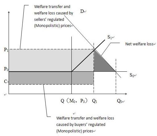 The deep grey part in the figure is the net loss of social welfare caused by administrative monopolies, we called it "social welfare loss I"; The light grey part in the figure is distribution distortion cause by sellers’ monopolistic (regulating) prices, we called it "social welfare loss II"; the grey part in the figure is distribution distortion caused by buyers’ monopolistic (regulating) prices (lower or zero resources prices), we called it "social welfare loss Ⅲ".