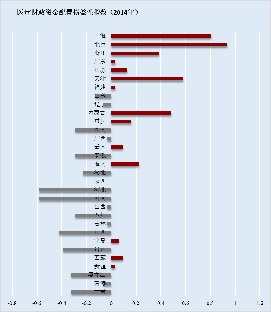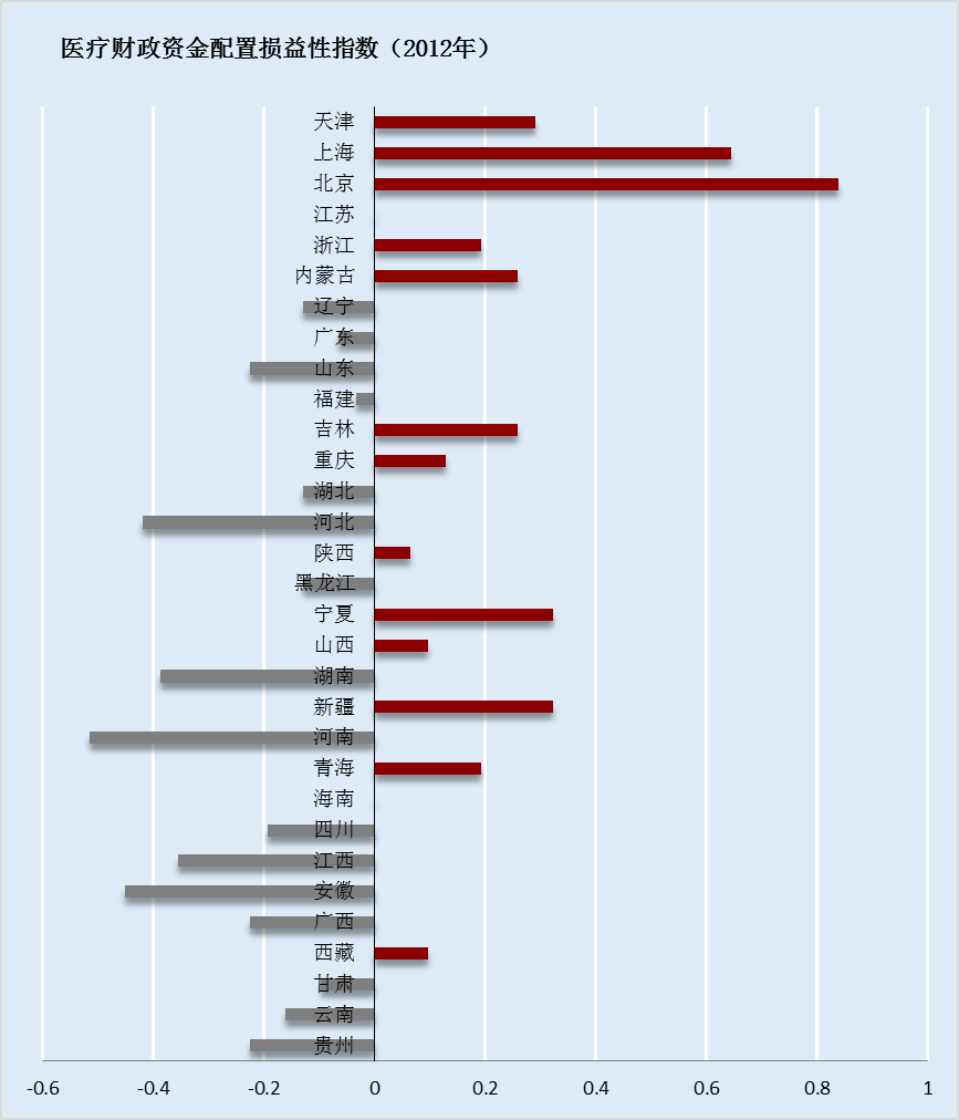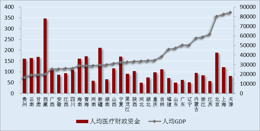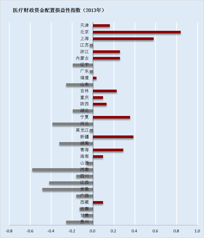 横轴按人均GDP从低到高排列,左侧纵轴为人均医疗财政资金。每一个地区份与处于右边的地区比较比,如果有一个地区比它低,则记1,有两个则记2,依次类推;如果比它高,则不记分;也与处于它右边的所有地区比,如果有一个地区比它高,则记-1,两个则记-2,依次类推;如果比它低,则不记分。将每一个地区的比较后的两个得数相加,除以地区数,在这里是31,就是它的“公正性的相对损益指数”。