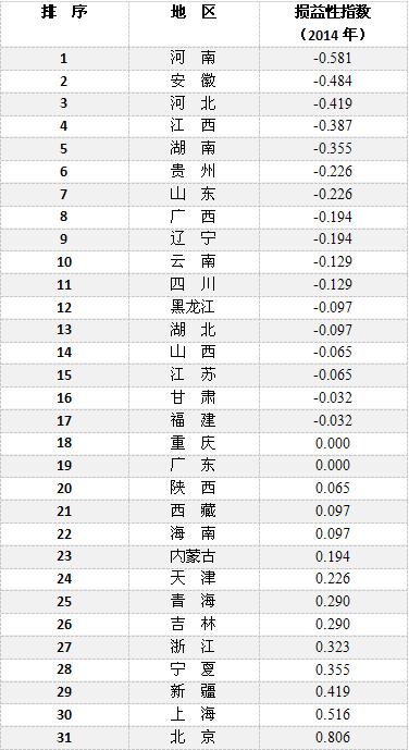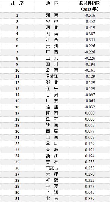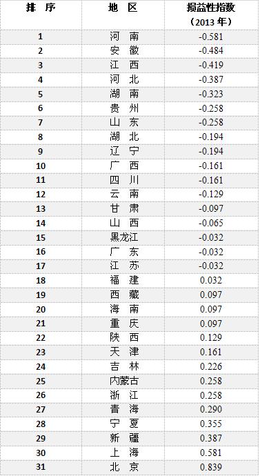 根据天则所“价值解读”,北京和上海是在这个财政分配体系中的“极不公正获益”者,而河南、安徽、河北、湖南、江西等省则是“不公正受损”者。