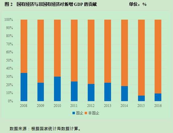 现在,这两种经济都足够巨大,其表现好坏足以影响中国经济至少1%的GDP增速。例如,根据李杨的《中国国家资产负债表2015》(中国社会科学出版社,2015),国有企业的总资产约为117万亿元(2013年),占全国总资产691万亿元的17%。而民营部门,包括新经济,自2000年以来创造了城镇所有新增就业岗位(17259万人),还抵补了国有企业减少的就业岗位;同时在每年新增GDP中的份额越来越大,仅在工业领域,2015年为93.1%,2016年为90.4%;如果考虑到服务业,这个比重更大。甚至可以说,我们近年来的经济增长主要依托于民营部门和新经济。新旧两种经济的性质和增长动力就对中国经济发展举足轻重。