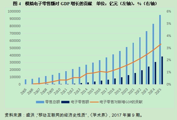关于新经济,目前没有专门的统计数据。我们能够获得的,是电子商务的数据。我在《移动互联网的经济史性质》一文中,根据已有的数据作了初步的分析和预估。新经济,尤其是网购的迅猛发展,使电子零售迅速成为中国经济中的重要推动力量。从2005年到2015年,电子零售交易额平均每年增长72.3%。2016年,中国电子零售交易额达51708亿元,约占当年零售总额的15.6%。如此规模已经大到使当年GDP增速了1个百分点。根据我们的分析模型,到2025年,电子零售及其带来的工业增加值将会增速GDP约3.5个百分点。这还只是对电子商务一个领域的静态分析。如果考虑到整个新经济,考虑到动态因素,如导致的分工专业化的深入、制度与技术的变革,新经济将会带来更大的经济动力。如果有人处于这一领域,就会感到乐观。