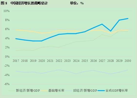 实际情况很复杂,中国经济的前景如何确实是一个悬念。然而如果我们简化问题,假定城镇化和巨国效应带来的经济增长大约贡献5-6%的增长率,而国有经济仍维持现状,每年带来负的3.3%的增长率,而新经济带来逐渐增长的对经济增长的贡献,到2025年可增速GDP约3.5%,2030年为5.5%,则合成的GDP增长率如下图。