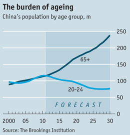 我先反驳第一个观点。很多人口学家都站在人口红利的角度讨论中国经济增长的问题。这是《经济学人》杂志里的一张图。从这张图上来看,在2010年前后,中国20-24岁年龄段人口的绝对数量是下滑的,这个现象大概出现在2010年,正好跟我前面讲的经济增长出现阶梯式下滑处于同一时间段,因为2009年我们有一个4万亿计划,经济增长有所上升,之后又开始下降,这个时点是吻合的,所以现在有学者认为经济增长速度下滑是一个人口的问题。