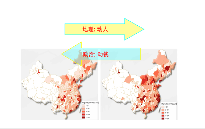 其中,左边这张图反映2000年中国的人口流动,右边这张图反映2010年中国的人口流动。颜色的深浅则代表流动人口的数量。颜色越深,表示这个地方的流动人口越多。要提醒大家的是,这里所说的流动人口都是从常住的移民角度来考虑,不包括短期的,即不包括6个月以下的短期移民,这里的流动人口仅包括在流入地每年居住6个月以上的移民。