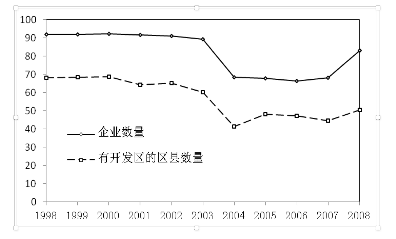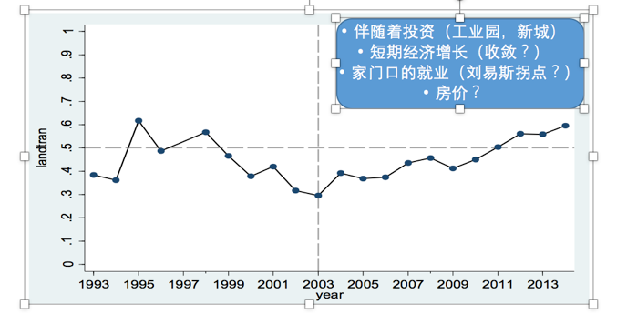 下面来看一下这张图,这张图中的实线表示中国的沿海地区在开发区企业所占的比重,虚线是沿海地区在有开发区的县中所占的比重。大家可以看到这两个比重,同时在2003年到2004年一年间下跌20个百分点。也就是说,关闭开发区,更多关闭的是东部的开发区,而且从那以后,中国开始把开发区建设当做一种鼓励中西部发展的手段,这背后配合的就是土地和钱。