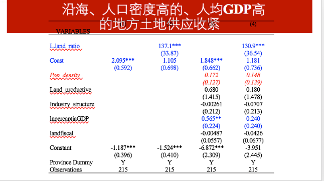 这个表格的含义是,根据我们的数据分析,如果把中国城市分成两个组别,一个组别是2003年以后一些城市收紧了土地供应,在全国土地供应当中所占的份额有所下降,而另一个组别的土地供应在全国所占的份额是上升的。根据这张表格分析,那些土地供应收紧的城市更加可能是沿海的、人均GDP高的、人口密度高的城市,而这些地方是人口流入地。大家可以思考一下,在市场经济条件下,怎么可能在这样的地方收紧土地供应呢?这个结果是行政配置资源所导致的。