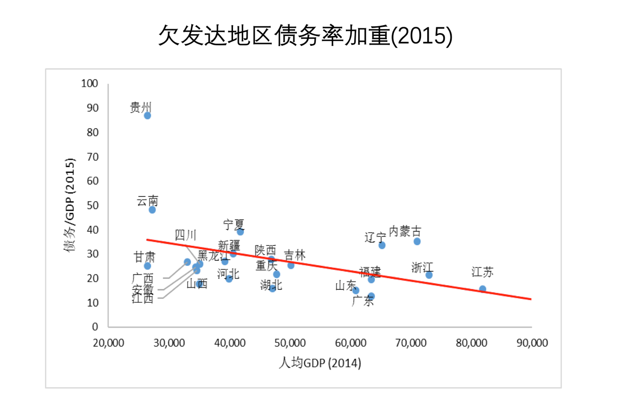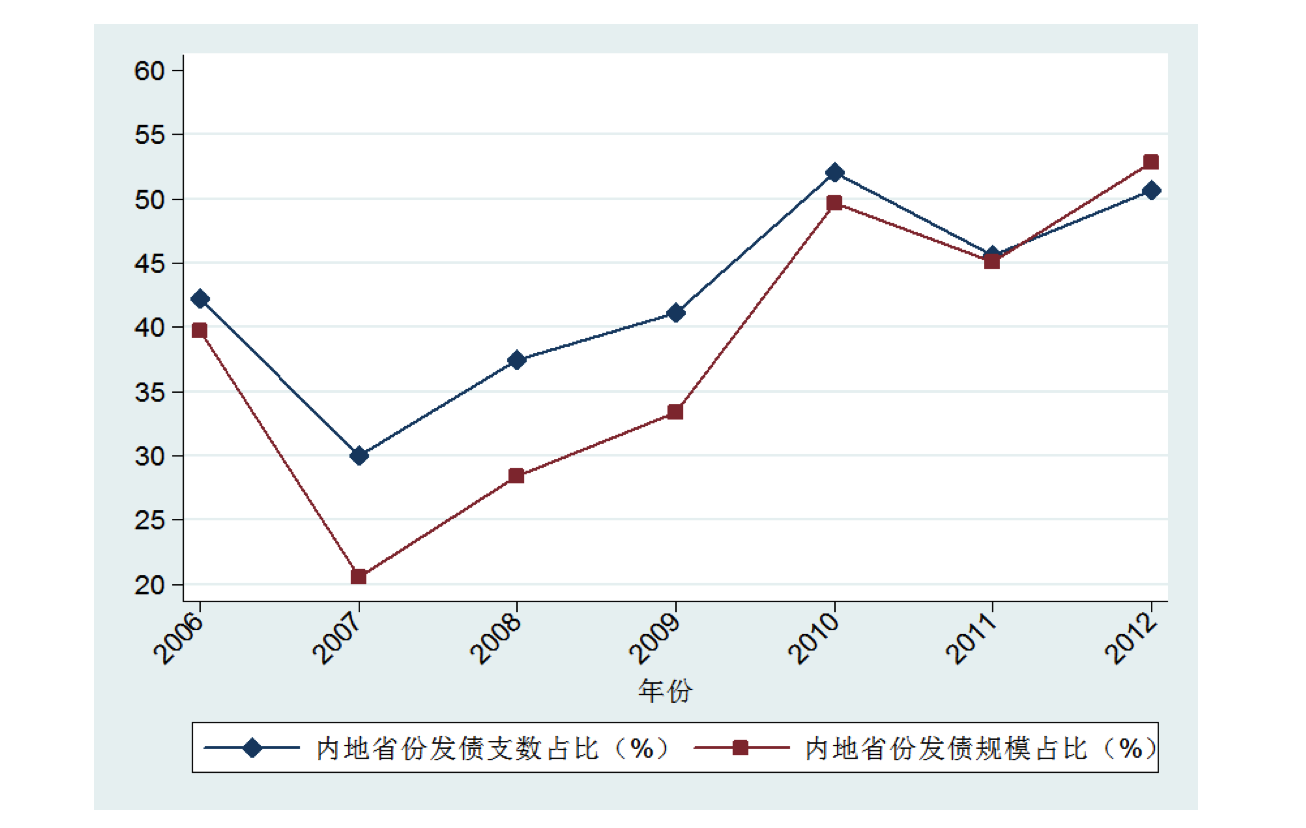 大家都知道,中国是不允许地方政府直接发债的,但是地方政府通过成立城投公司借了大量的城投债。这张反应了中国的中西部省份在全国发行城投债中所占的份额,其中,蓝色的线是发行城投债支数的份额,红色的线是发行城投债的规模所占的份额,中西部的两个份额都在上升。