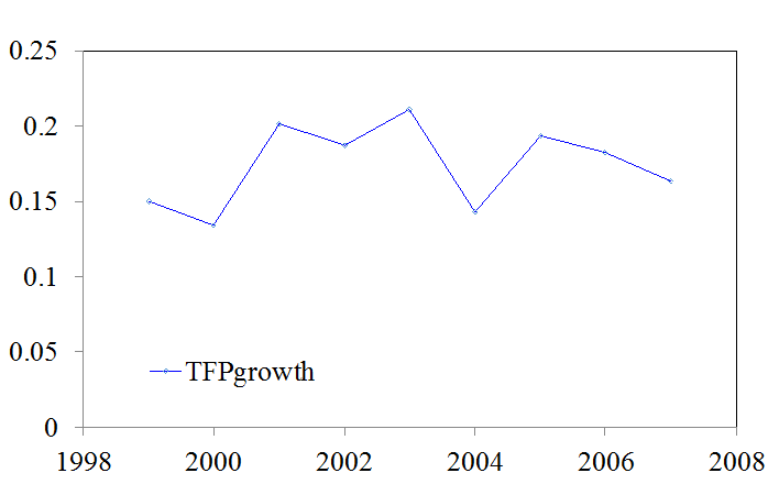 这张图是我们根据中国工业企业数据做的,我们先去计算每一个企业全要素生产率的增长率,然后再加到全国,所以这张图上的趋势是用全中国的工业企业数据加总的全要素生产率增长率。请大家看,在2003年之前,这条线总体还是往上走的,到2003年开始冲到顶点,就开始往下走了。大家可能会问我,这张图为什么到2008年就截止了,因为我做研究的时候,这个数据就到2008年,这些年的数据还在不断更新。最近这些年,中国TFP整个全要素生产率是持续下滑的,拐点在2003年。