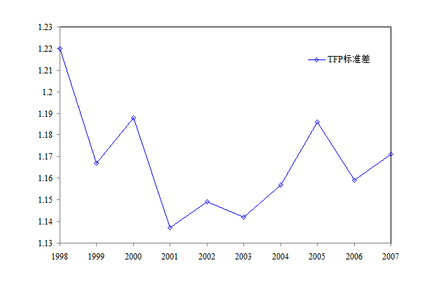 我刚才讲的是全要素生产率在全国层面的变化,我们接下来看第二个指标,企业之间的TFP的标准差,这个指标的用处是度量企业和企业之间资源错配的程度。这个方法也很简单。比如说在座的各位都是一个企业,我给每家企业都算一个全要素生产率,然后我计算你们全要素生产率的差别。大家想,根据经济理论,如果要是市场经济在配置资源的话,你们之间的效率差别应该越来越小才对,就这么一个简单的道理。否则的话,经济资源就会从效率差的企业到效率好的企业,直到差距足够小为止。