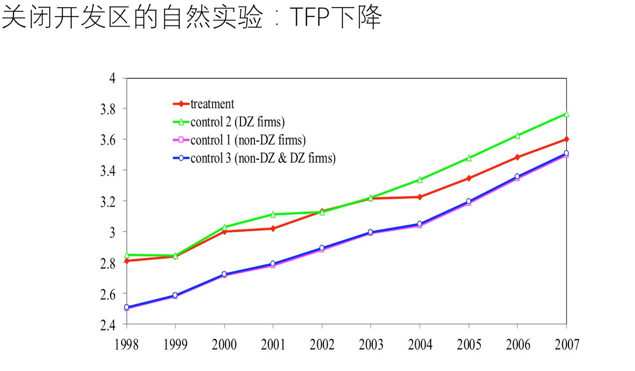 绿线表示没有受到我刚才讲的关闭开发区政策影响的企业,一直是开发区企业。请大家看,当没有任何政策干预的时候,这些企业的全要素生产率很好,几乎是直线地往上长。