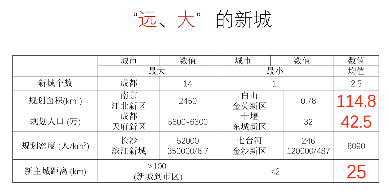 新城不仅建得多,而且建得又远、又大。在样本里,中国平均每个城市建了2.5个新城,这是我要给大家报的第一个数。第二,我们的样本里规划新城,平均规划面积是114平方公里,这是什么概念?就是一个不小的城市拔地而起。这些城市平均规划的人口是42.5万,这如果放到欧洲或者美国是大城市的概念了。第三,在我们的样本里平均新城建到距离它所在的老城区25公里。我们生活在北京可能觉得25公里好像也不太远,大家要知道,中国绝大多数城市半径都10公里不到。我给你一个参照系,比如上海,从人民广场市中心出发往边上走,基本上短的地方25公里、30公里就到了这个中心城区的边界了。我今天给大家讲的新城建设,平均来讲距离它所在老城的中间可以再放下一个城市,就这个概念。