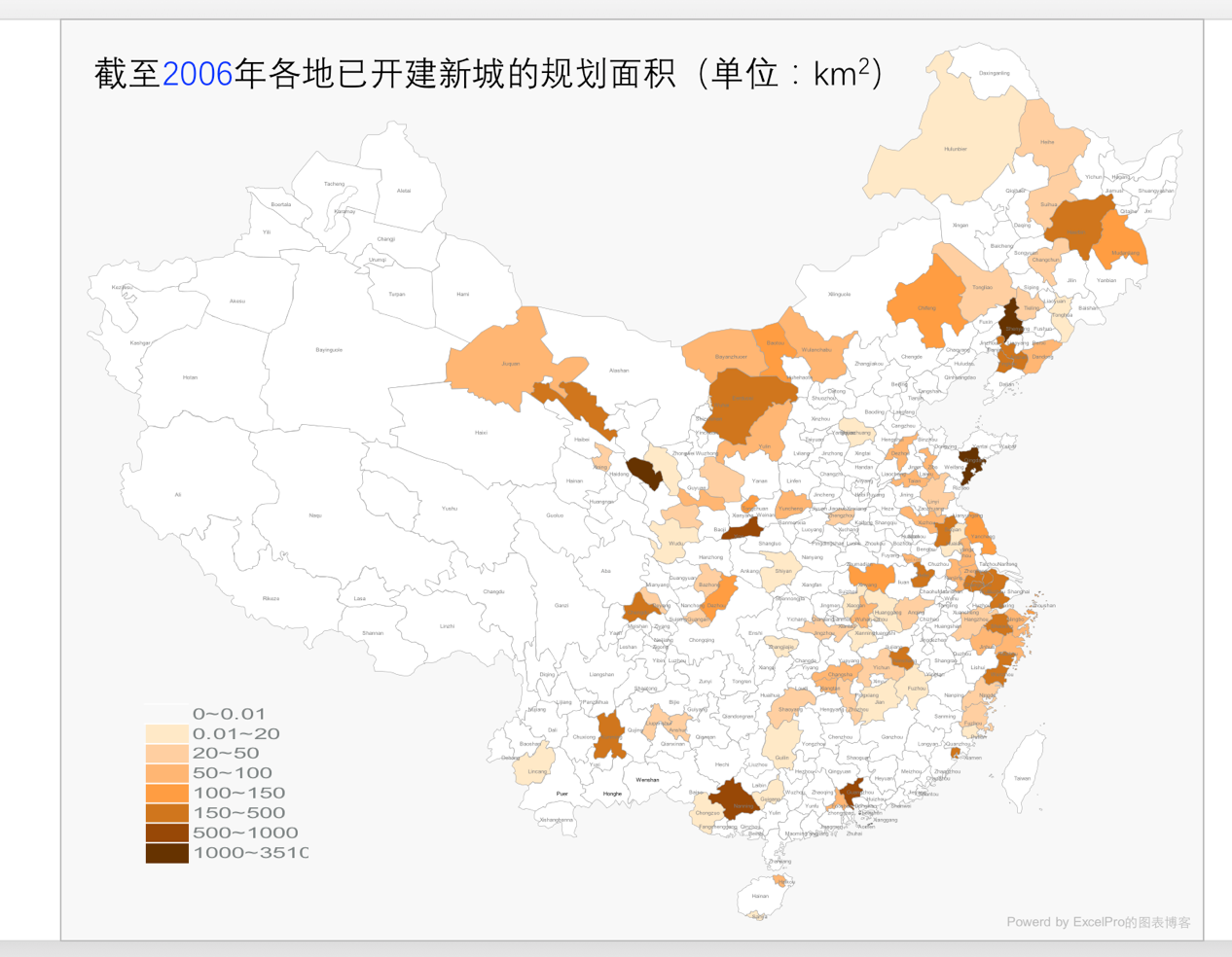 我们接下来再看空间分布,上图,我们把自己收集的样本在这张图上画出来了。这张图上的颜色越深,就表明这个地区开建的新城的面积越大。2006年中国开始进入新城建设的高潮。最开始好像还没有那么明显的规律,似乎沿海地区还建了不少新城。请大家注意2010年,当时4万亿计划推出以后各个地方开始大搞投资,大家可能知道,大量的投资在基建里,而大量基建不是维护老城市的道路、水管,而是在建立新城。到2010年的时候,中国新城大量地出现在东北,西北、西南。