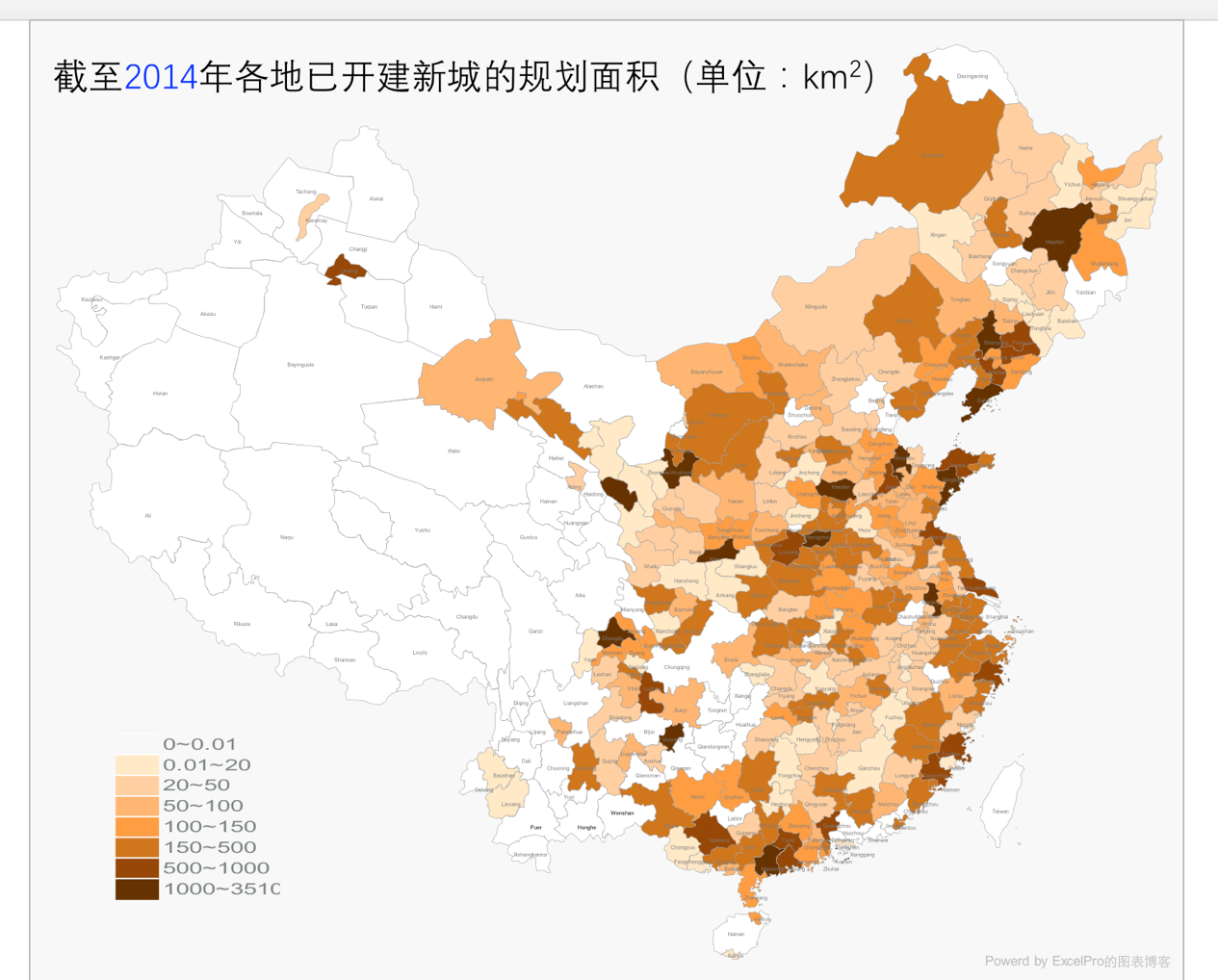 随着时间推移,到我的样本最后一年(2014年),中国的新城建设开始退潮了。请大家看这张图,就在我们的不完全统计中,全国287个地级市,已经有270多个建有新城了。大量颜色深色块出现在东北、西北、西南,而这些都是人口流出地。