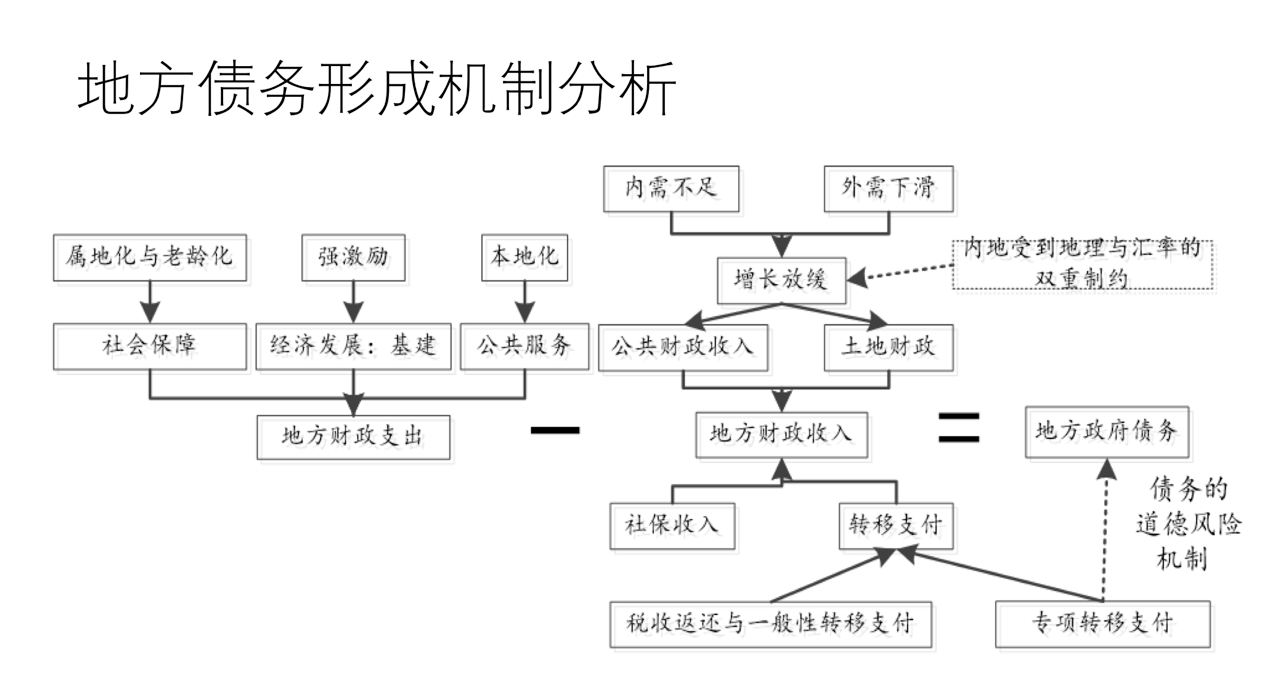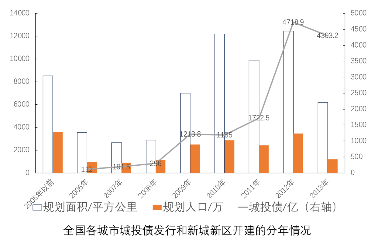 我给大家在这张图上看的直线,就在当年的新增的城投债。基本上柱子上去债务就跟着上去,或者晚一年也跟着上去。也就是说,大量新城的建设背后伴随着负债。