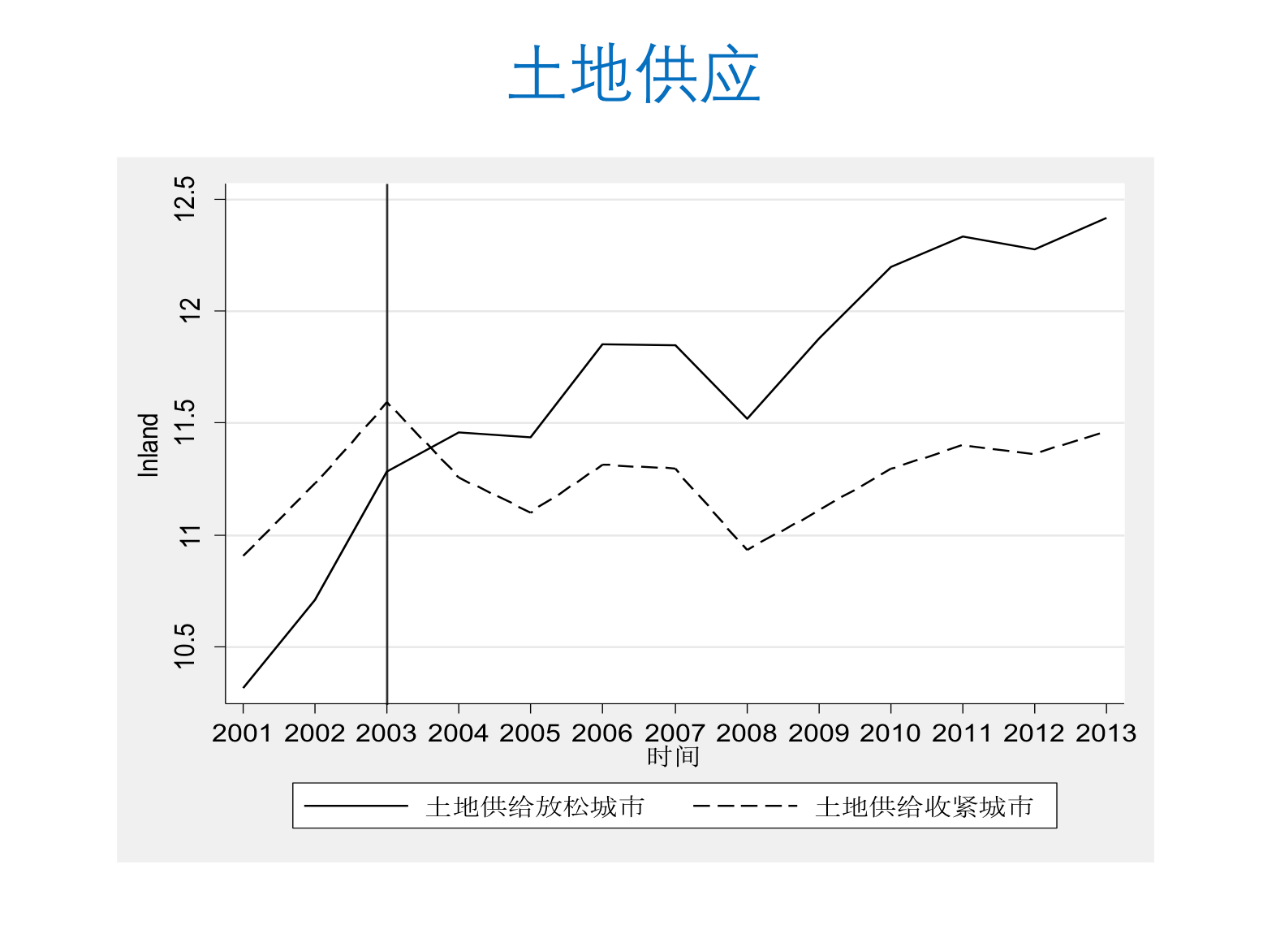 我前面讲过,中国在2003年以后,通过行政力量把建设用地指标配置给城市。于是,我就按照中国城市分成两组,一组是2003年以后土地收紧的,一组是放松的。放松还是收紧呢?我就用一个指标,看一个城市的土地供应份额在全国占比是上升还是下降的。如果占比是上升的,就是放松,下降的就是收紧的,所以有两条线,其中,上面黑色的实线代表土地供应放松的城市,虚线表示土地供应收紧的城市。纵轴是土地供应,而且这里的土地供应是当年的流量,在我这个组里面取平均值。