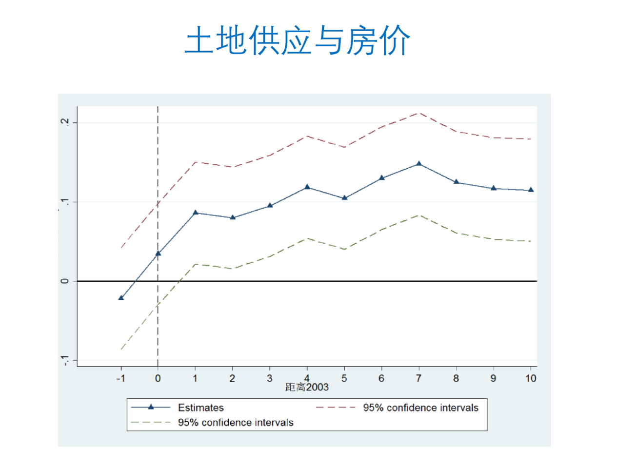 再往下,我们来看房价会出现什么结果。这张图就是用人口流入地、土地供应收紧组别的房价,减掉土地供应放松组别的房价,图中的零点就是2003年,虚线分别代表95%的置信区间。在2003年和2002年,这两者的房价没有统计上的显著差别。2003年以后,土地供应收紧组别的房价减掉土地供应放松组别的房价,开始显著为正了。而且之后总体上来讲,除了经济危机和经济形势不好这几年,总体上两个组别的房价差别是扩大了。