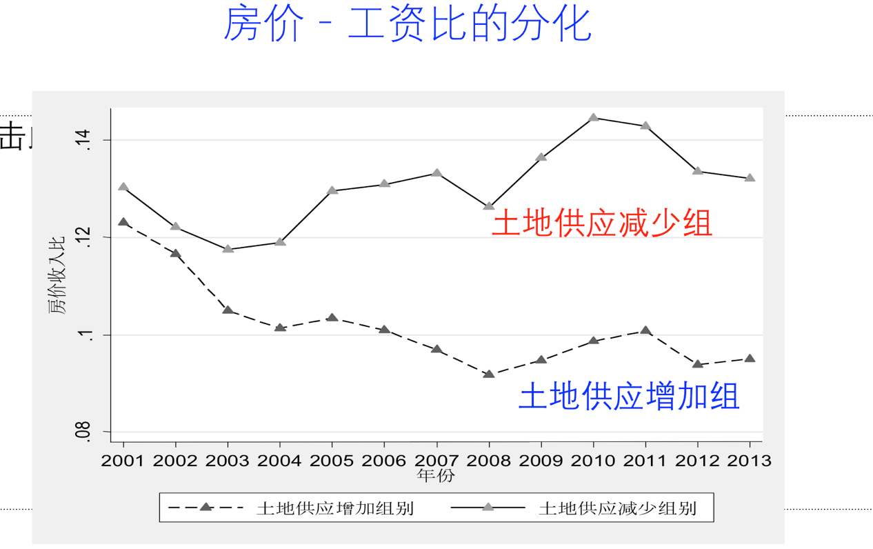 这张图中的数据是我们在城市层面计算的房价除以工资比。然后我再分成两个组别,在每个组内部计算平均值,然后就画出了这张图。上面这条线是土地供应减少组别,下面这条线是土地供应增加组别。在2003年之前,这两个组别的房价(房价除以工资比)都是下跌的。