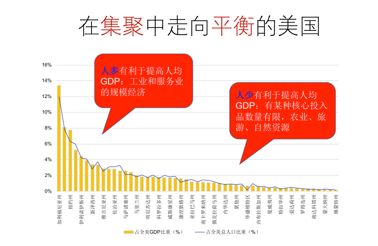再请大家看蓝色的线,这是美国的每一个州在人口当中所占的份额,也高度集中。大家用最简单的的数学都应该知道,美国州之间的人均GDP是几乎一样的。所以美国被我称之为“在集聚中走向平衡的国家”,而在这样的国家内部是有高度分工的。左边这些州在做现代制造业、服务业,有规模经济,人也过来了。右边的州在发展农业、旅游、自然资源,劳动力流出,人均提高。两边都好,高度分工。