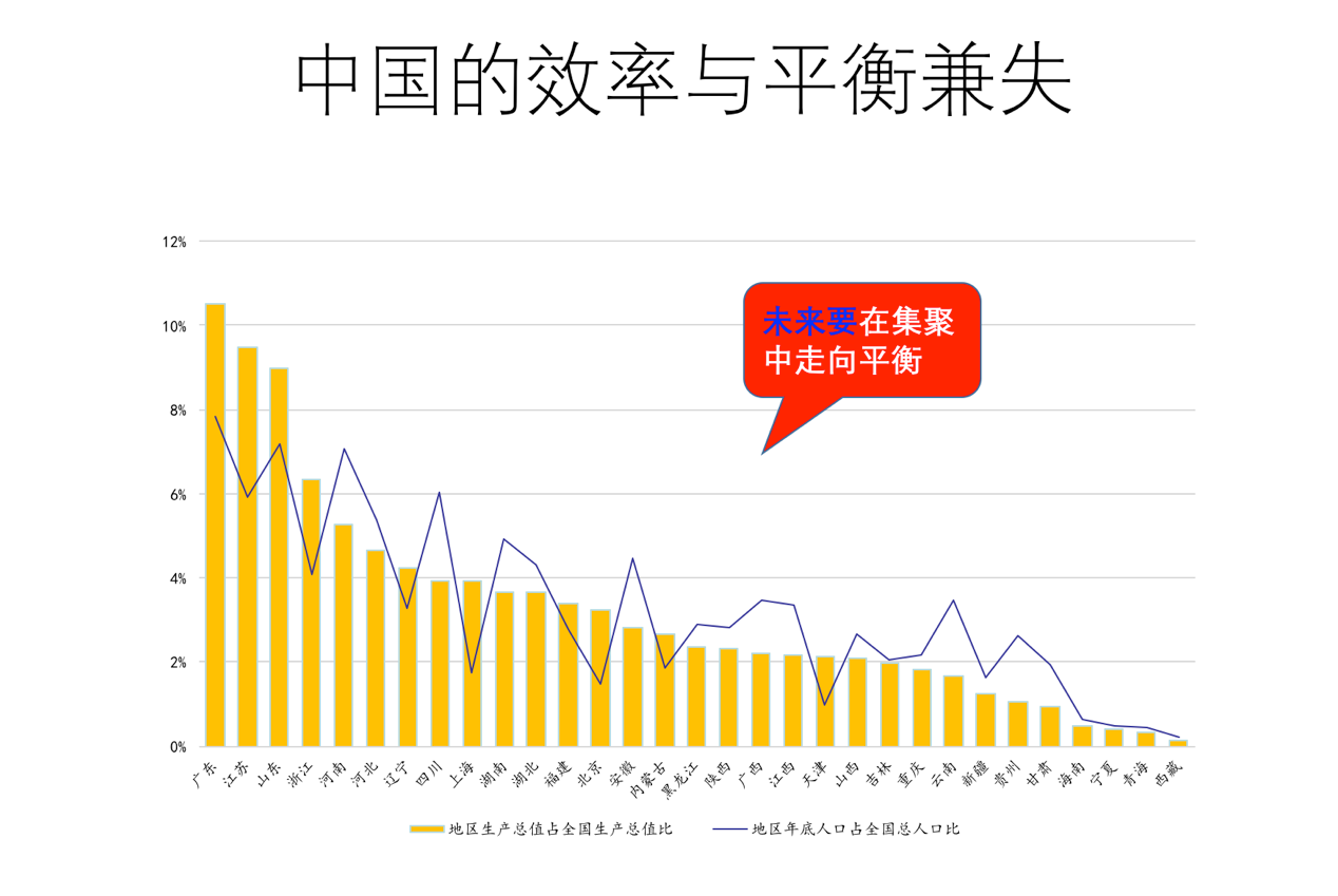 给定黄色柱子,中国真正的问题在哪里?不是黄色柱子代表的经济太集中了,而是蓝色的线(人口集中)没有跟上黄色的柱子。大家想,如果蓝色的线跟上黄色的柱子,像美国一样,是不是人均就一样了,这是很简单的道理。