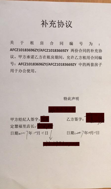三、合同方于签订《北京市房屋租赁合同》(合同编号:AFCZ10183669ZY)的同一天签订了《补充协议》,明确约定承租的两套房子用于办公使用。