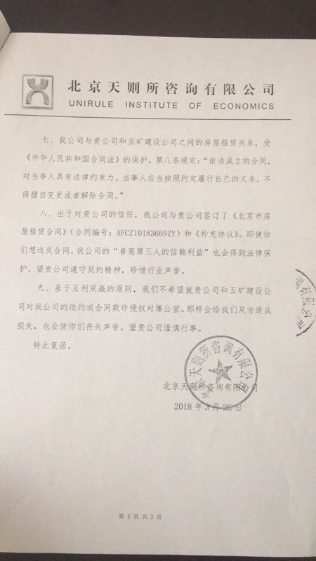 八、出于对贵公司的信任,我公司与贵公司签订了《北京市房屋租赁合同》(合同编号:AFCZ10183669ZY)和《补充协议》。即使你们想违反合同,我公司的“善意第三人的信赖利益”也会得到法律保护。望贵公司遵守契约精神,珍惜行业声誉。