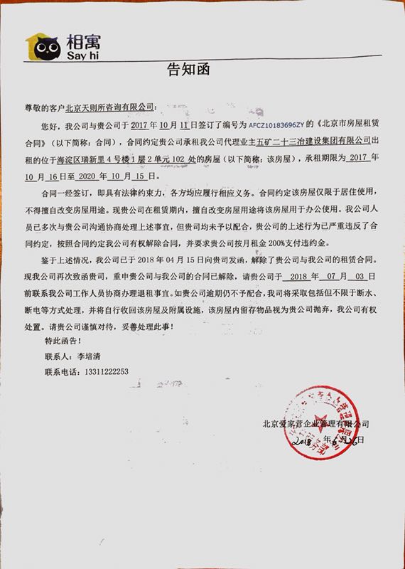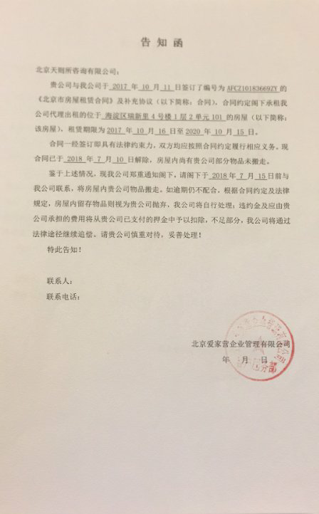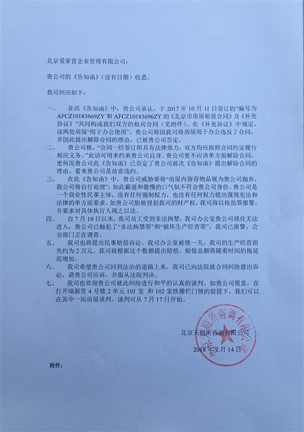 7月14日上午,收到爱家营公司的《告知函》(附件八),函中承认与我司的租房合同包括主合同和《补充协议》,否定了它要解除合同的理由,即我司违约将房屋用于办公。但却威胁我司在15日前与该公司联系并将屋内家具和设备搬出,否则认为被我司“抛弃”。