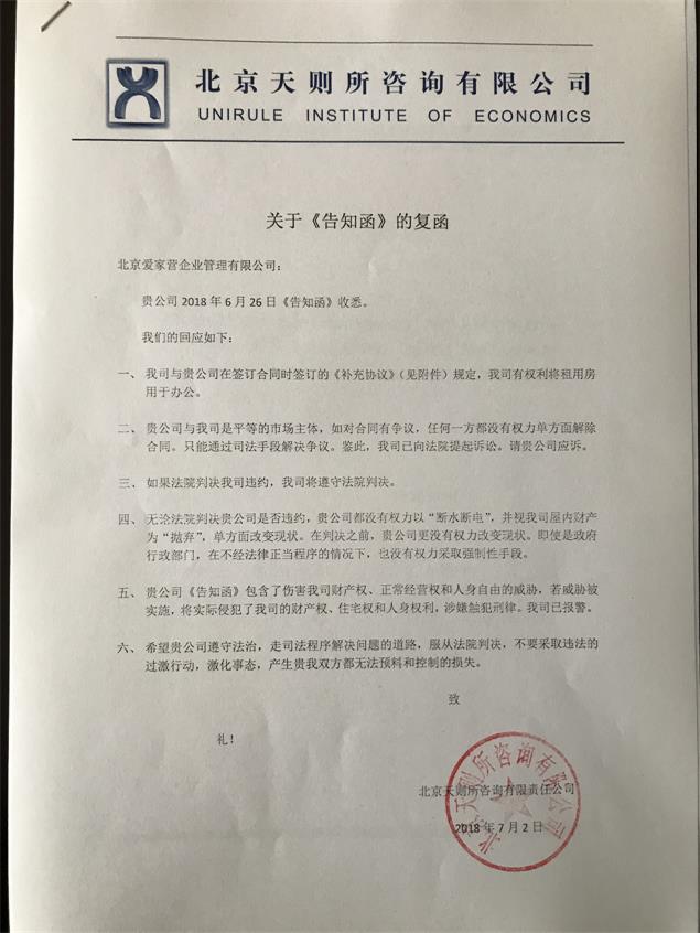 6月26日,爱家营公司送来《告知函》(附件四)。威胁我司要“断水断电”,并威胁将我司的室内财产视为“抛弃”之物。我司在《关于告知函的复函》(附件五)中指出,如果双方对合同有争议,可请法院裁决。