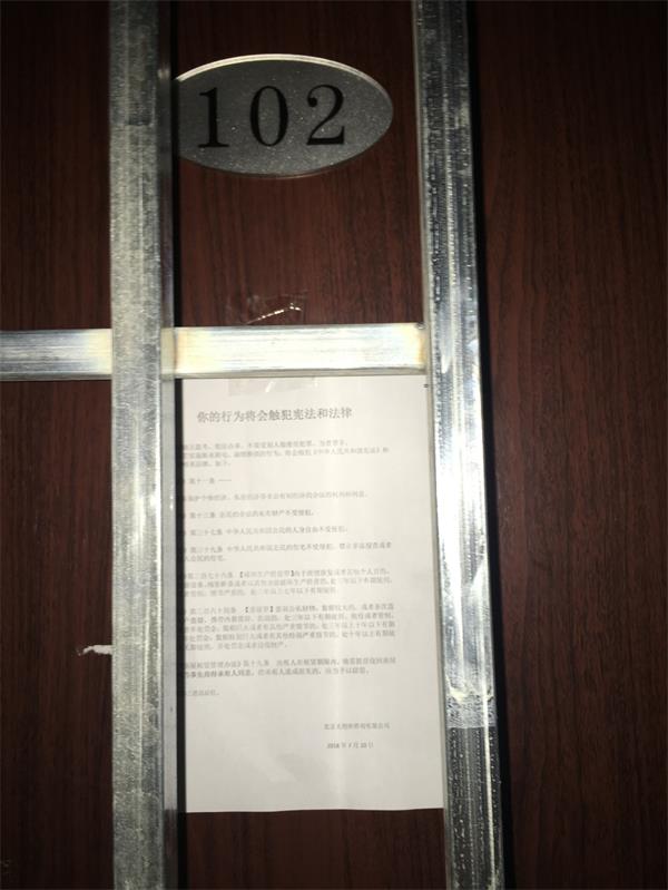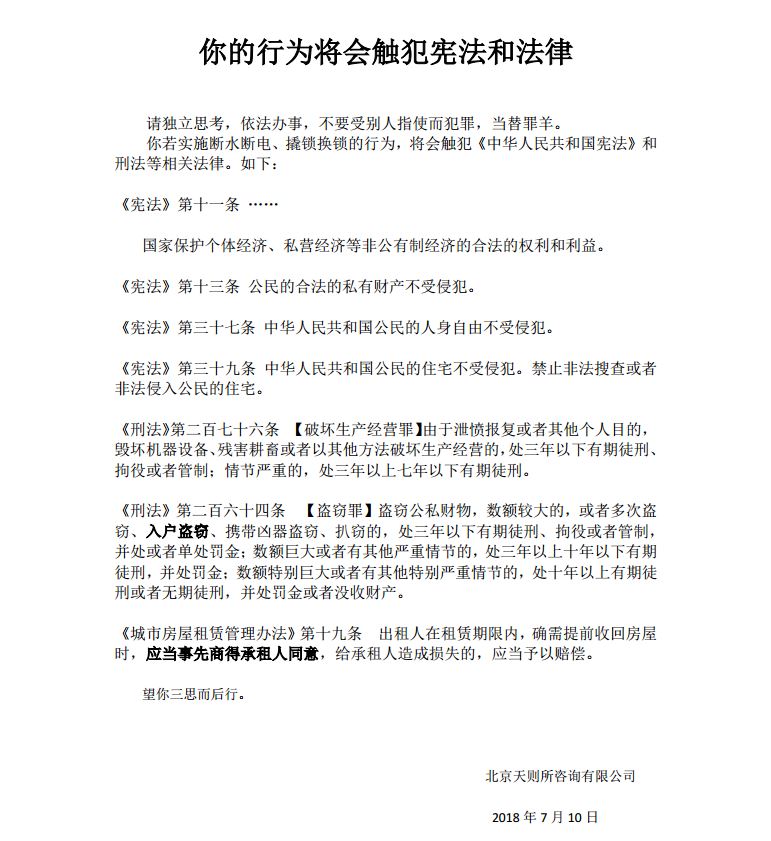 我司印制了“你的行为将会触犯宪法和法律”的警告书(见附件六),贴在门上,并准备给前来实施断水断电和撬锁换锁的人事先阅读。