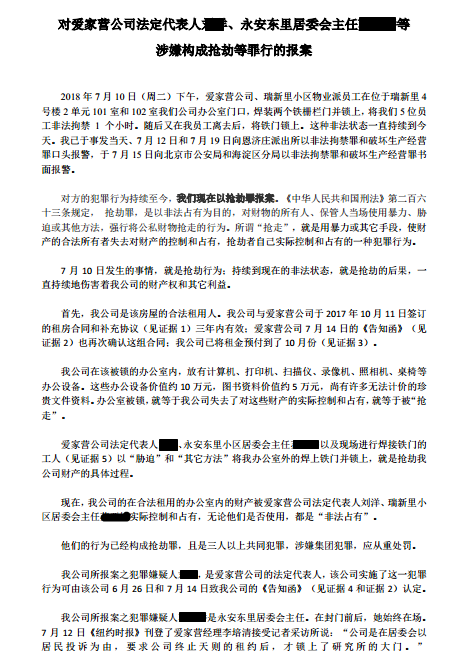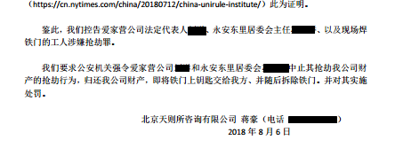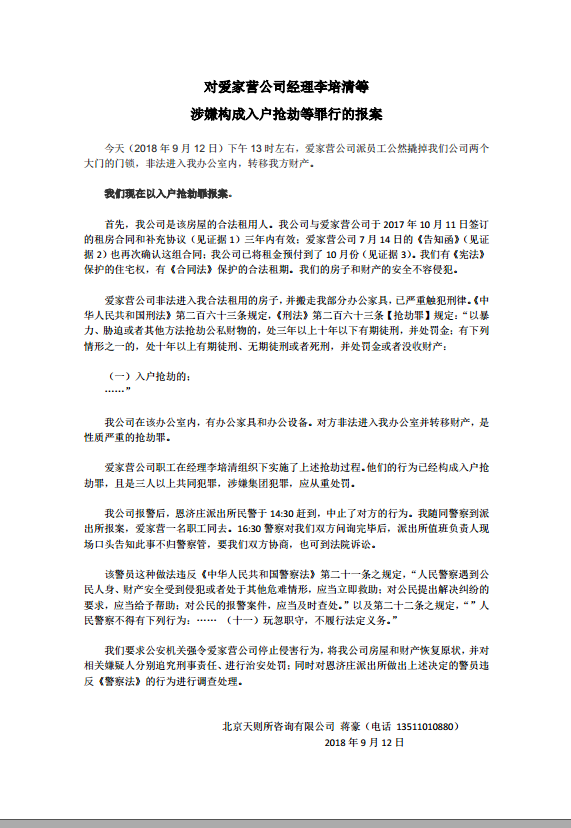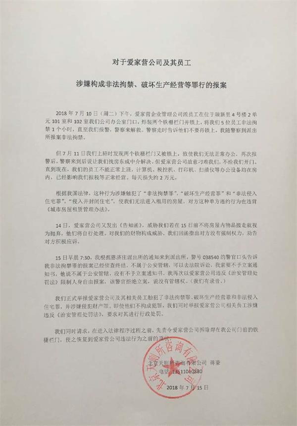 7月15日下午,我司向北京市公安局和海淀分局发出书面报警(附件十)。并要求警方责令爱家营公司拆除铁门。
