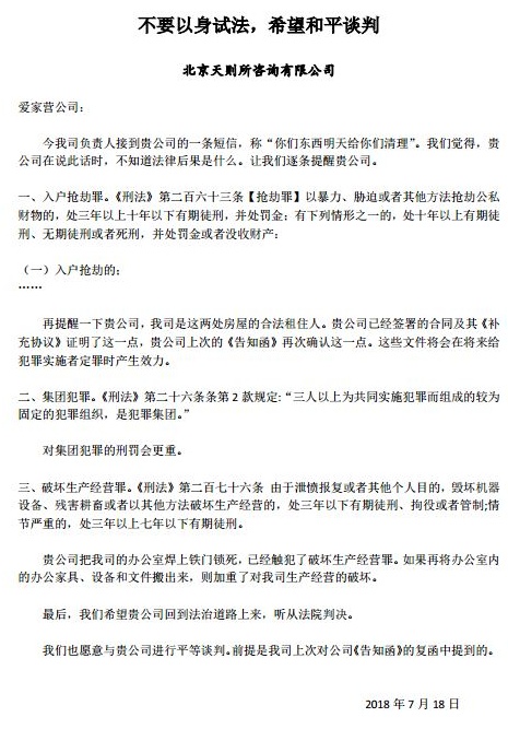 7月18日,爱家营公司给我司负责人来微信说“你们东西明天给你们清理”,我司以“不要以身试法,希望和平谈判”(见附件十一)的警告信回应。