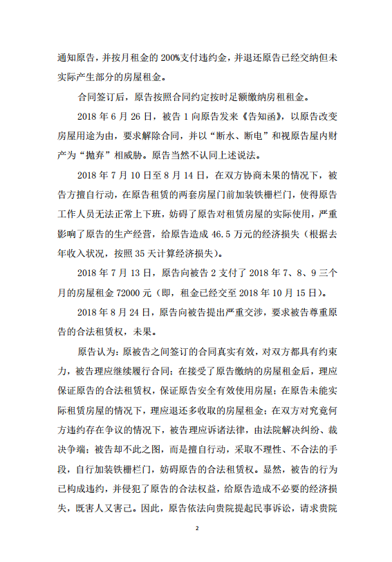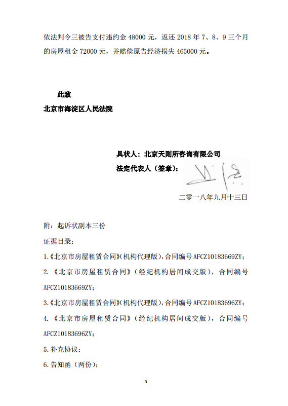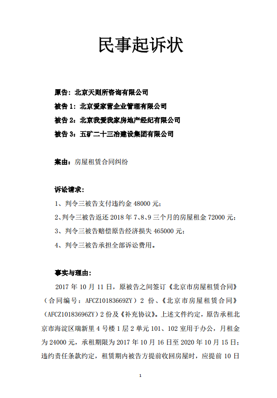 9月14日,我司就爱家营公司通过封门等非法手段迫使我方搬离瑞新里办公地点事,向海淀区法院提起诉讼。