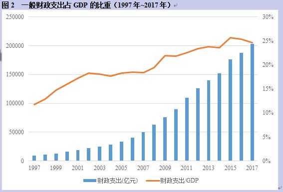 然而随着市场化改革的推进,市场经济焕发出越来越高的效率,涌流出巨大财富。政府部门的参照系也从计划经济逐渐转变到市场经济本身。在这时,税率仍由政府行政部门主导,仍没有任何制度约束。政府行政部门即使不是有意的、也是经济人本性驱使它逐渐增大宏观税率。这包括以税收为主的一般财政预算收入,以土地财政为主的政府性基金收入,国有企业占有的资源和资产的机会收益,以及医疗养老保险。从1997年到2017年,一般财政支出从占GDP比重的11.7%增加到24.6%,提高了12.9个百分点。