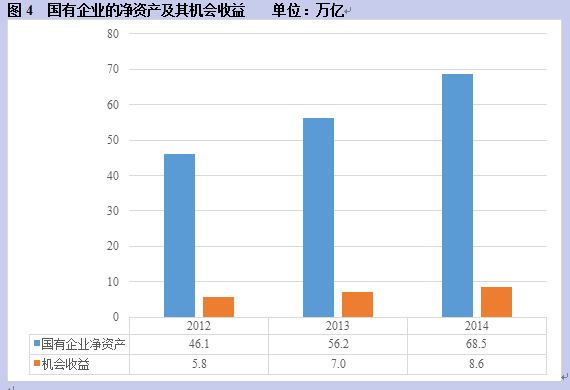 据李扬的研究,国有企业的净资产也在逐年显著增加,从2012年的46万亿上升为2014年的69万亿(《中国国家资产负债表2015》,中国社会科学出版社,2015,第43页)。按照合理的利润率,即无风险利率加上合理的风险溢价(廖理和汪毅慧,“中国股票市场风险溢价研究”,《金融研究》,2003年第4期),约为6.15%加6.38%等于12.53%估计,如此巨大的净资产的机会收益应有数万亿。见下图。这也是宏观税率的一部分。