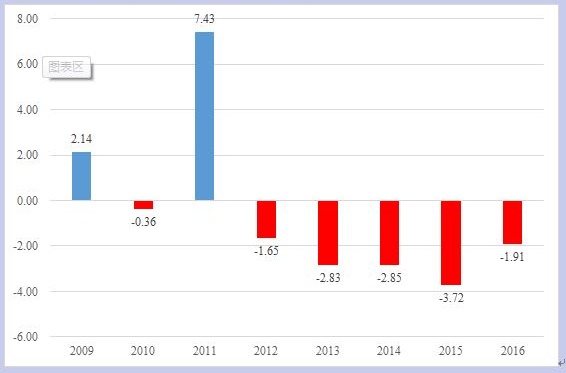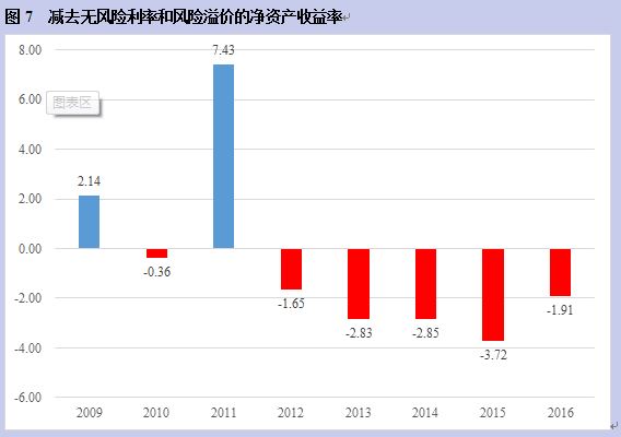 应该注意的是,这只是平均值。如果企业的净资产收益率呈正态分布,如果企业的净资产收益率减去无风险利率和合理的风险溢价为零,则大约一半企业的资本收益低于市场合理水平。用2012年至2016年的平均值-2.6%估计,这样的企业比例就会大幅度增加。这是因为如果企业净资产收益率呈正态分布,它们大多集中在平均值附近。如果平均值向负的方面移动,即使很小,也意味着有明显多于一半的企业资本得不偿失。如下图。
