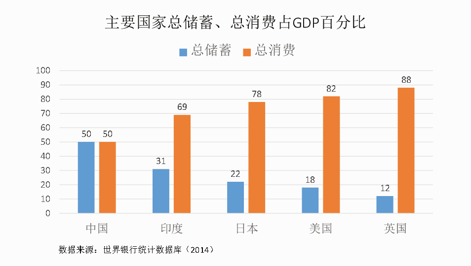 政府的收入除了必要的行政开支,不可以用于消费,只能用于投资。所以中国经济的主要需求是投资,而非消费。请看下面这张图,在世界各国中中国的储蓄(绝大部分都转换成投资)是最高的。