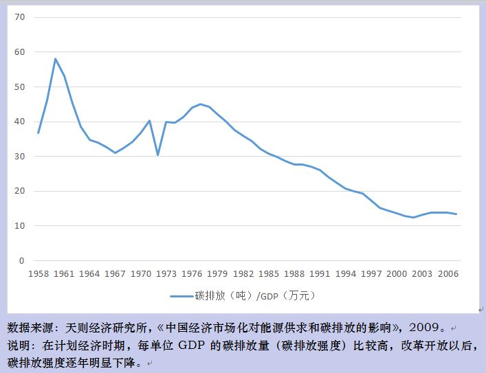 然而,科斯理论的基本精神还是可以用来指导环保工作。即在采取环保措施时,一定要想到其可能产生的成本和带来的损失。其实,在环保时不违背市场原则,考虑效率因素,也正是环保所需。因为我们不仅要从绝对量上考察排污,也要从每单位经济产出的排污量来考察环保成绩。我们在2009年做过《中国经济市场化对能源供求和碳排放的影响》研究,发现“从1980年到2005年,中国的市场化指数从4提高到6.3,碳排放效率(GDP/碳排放)从920美元/吨提高到2560美元/吨。”反过来,就是每单位GDP的碳排放强度(碳排放/GDP)在下降,“从1980年到2004年,OECD国家的碳排放强度指数平均每年下降2%,而中国的这一数字则为4.4%”。因为有这样的底气,温家宝总理才在2009年哥本哈根气候峰会上承诺,中国到2020年,碳排放强度比2005年还要下降40~45%。如果采用政府直接干预的方法减排,也许会降低一些碳排放,却因更大幅度地降低经济产出,而使碳排放强度提高。
